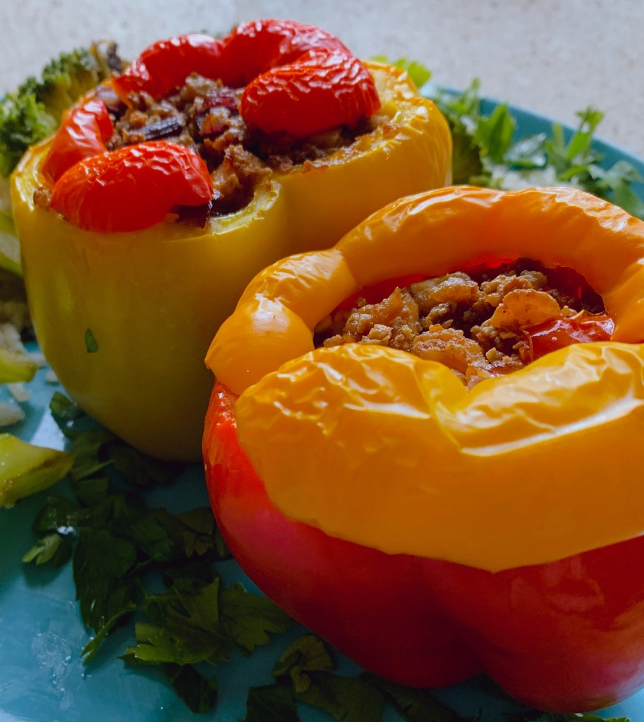 - Serve bell peppers with rice and sprinkle some of the ingredients I mentioned in the optional bar